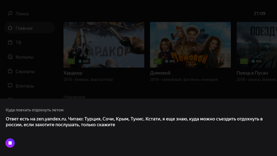 А если оставаться на главной странице, то пользователь увидит список последних использованных приложений, и очень длинный список с рекомендованным контентом, также разбитый на категории. В нижней части домашней страницы расположены значки для вывода краткой справки по работе с Алисой, для перехода к работе с аккаунтами, для вывода списка приложений и для перехода к настройкам.