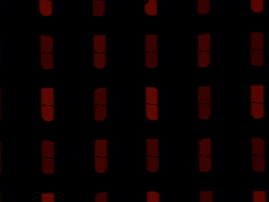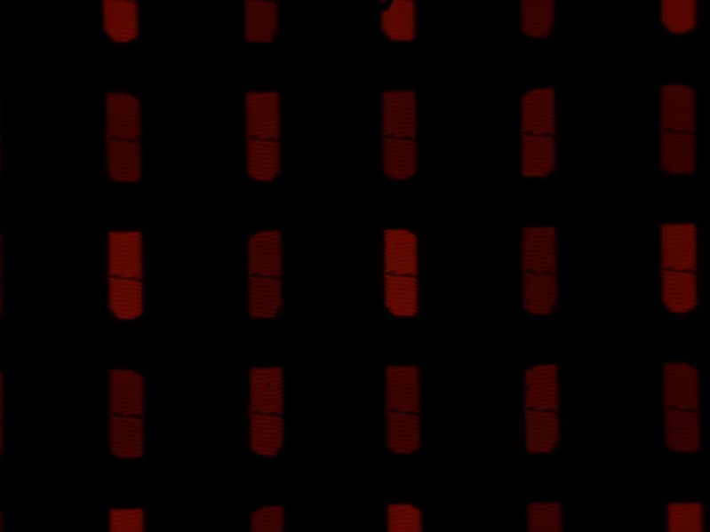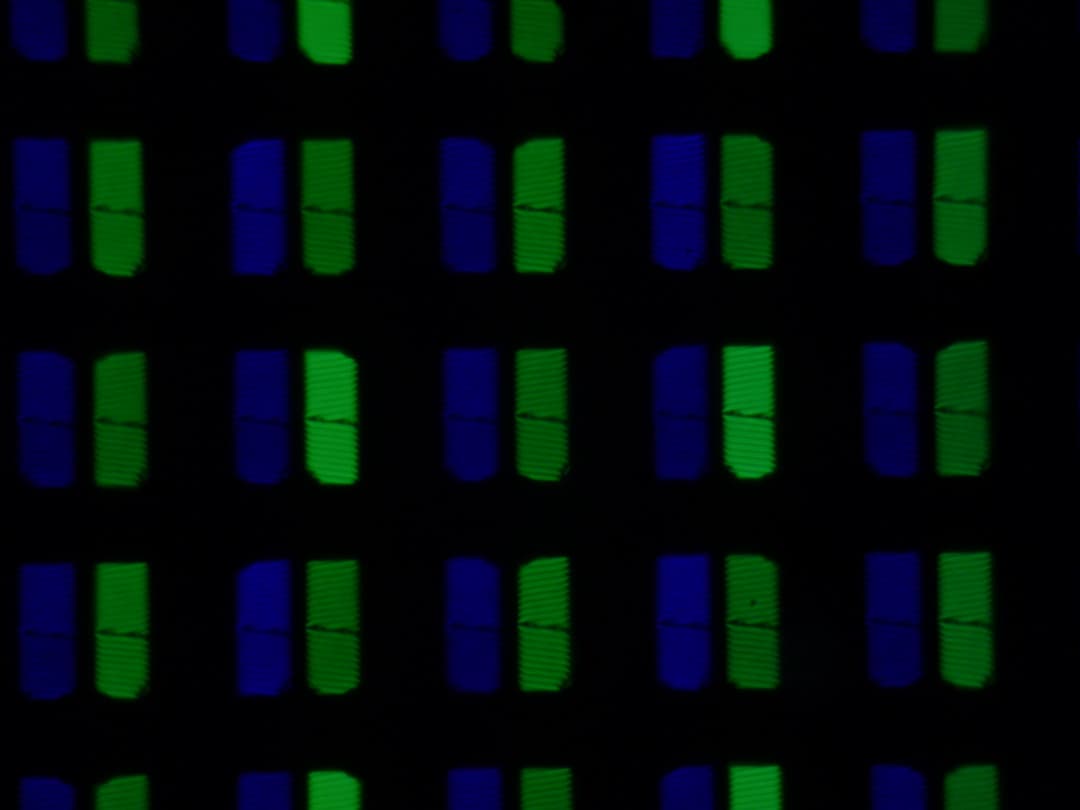 При снижении яркости выводимого оттенка яркость части субпикселей сильно снижается. Например так выглядят темно-сине-зеленое и темно-красное поле при не очень большом увеличении: