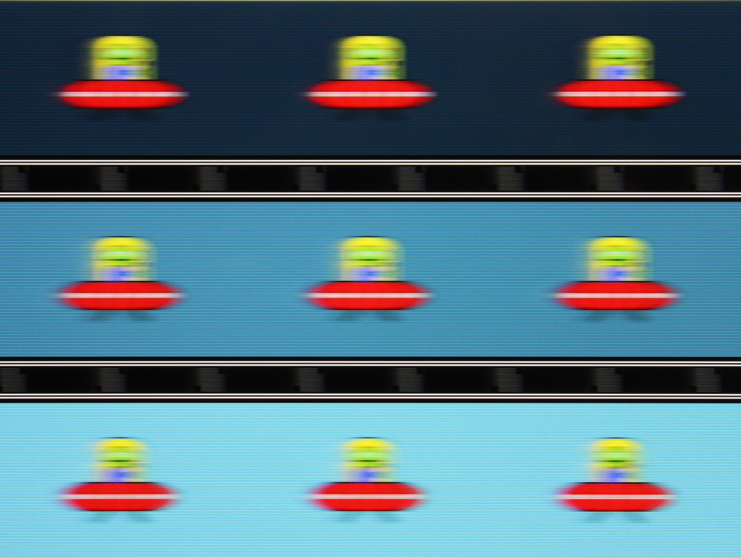 Для наглядного представления о том, что на практике означает такая скорость матрицы и какие могут быть артефакты от разгона, приведем снимок, полученный с помощью движущейся камеры. Такие снимки показывают, что видит человек, если он следит глазами за двигающимся на экране объектом. Описание теста приведено тут, страница с самим тестом тут. Использовались рекомендованные установки (скорость движения 960 пиксель/с), выдержка 1/15 с.