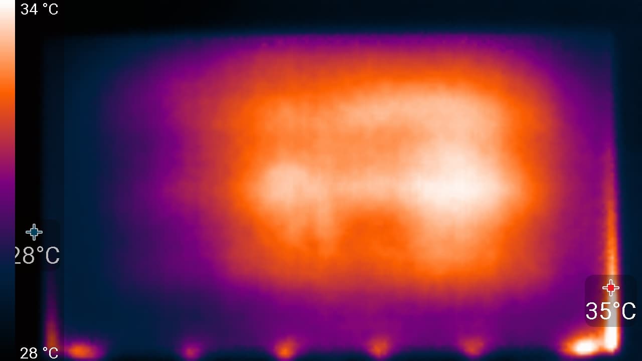 Нагрев телевизора можно оценить по приведенному снимку с ИК-камеры, полученному после долговременной работы на максимальной яркости в помещении с температурой примерно 24 °C: