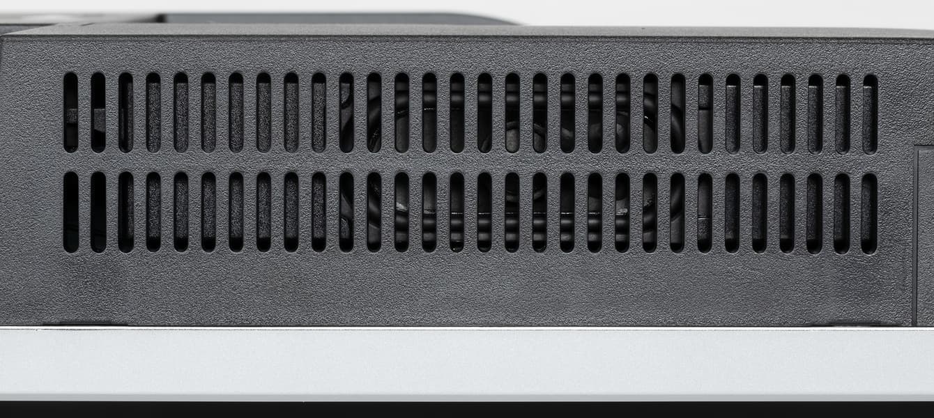 На пластиковом кожухе сзади, сверху и снизу есть вентиляционные решетки. За решеткой на нижнем торце можно разглядеть пару громкоговорителей с вытянутыми диффузорами.