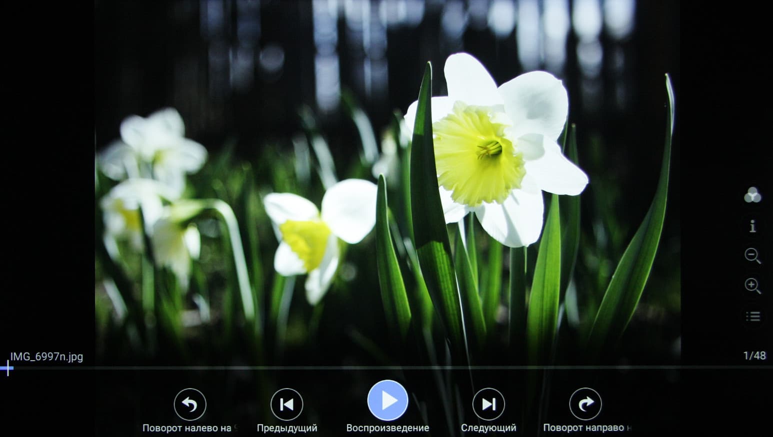 Нами подтверждена способность встроенного плеера телевизора показывать растровые графические файлы в форматах JPEG, GIF, PNG, MPO (один ракурс) и BMP, в том числе в виде слайд-шоу.