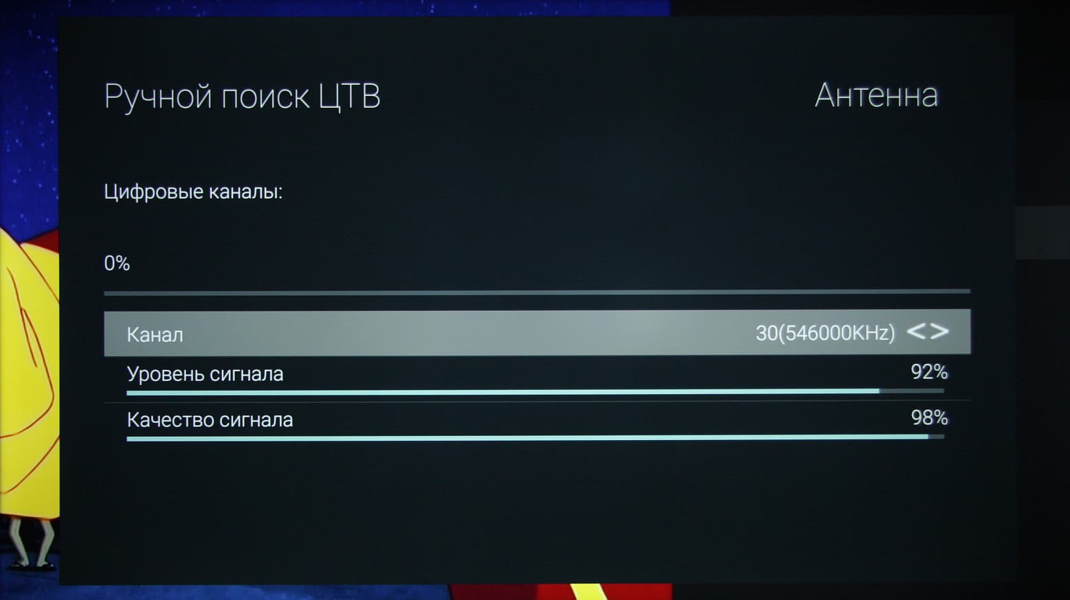 Данная модель, помимо спутникового тюнера, оснащена тюнером, принимающим аналоговый и цифровой сигнал эфирного и кабельного вещания. Качество приема цифровых каналов на дециметровую антенну, закрепленную на стене здания (почти прямая видимость в направлении на телевышку в Бутово, расположенную на расстоянии 14 км), было на высоком уровне — без проблем удалось найти ТВ-каналы в трех мультиплексах.