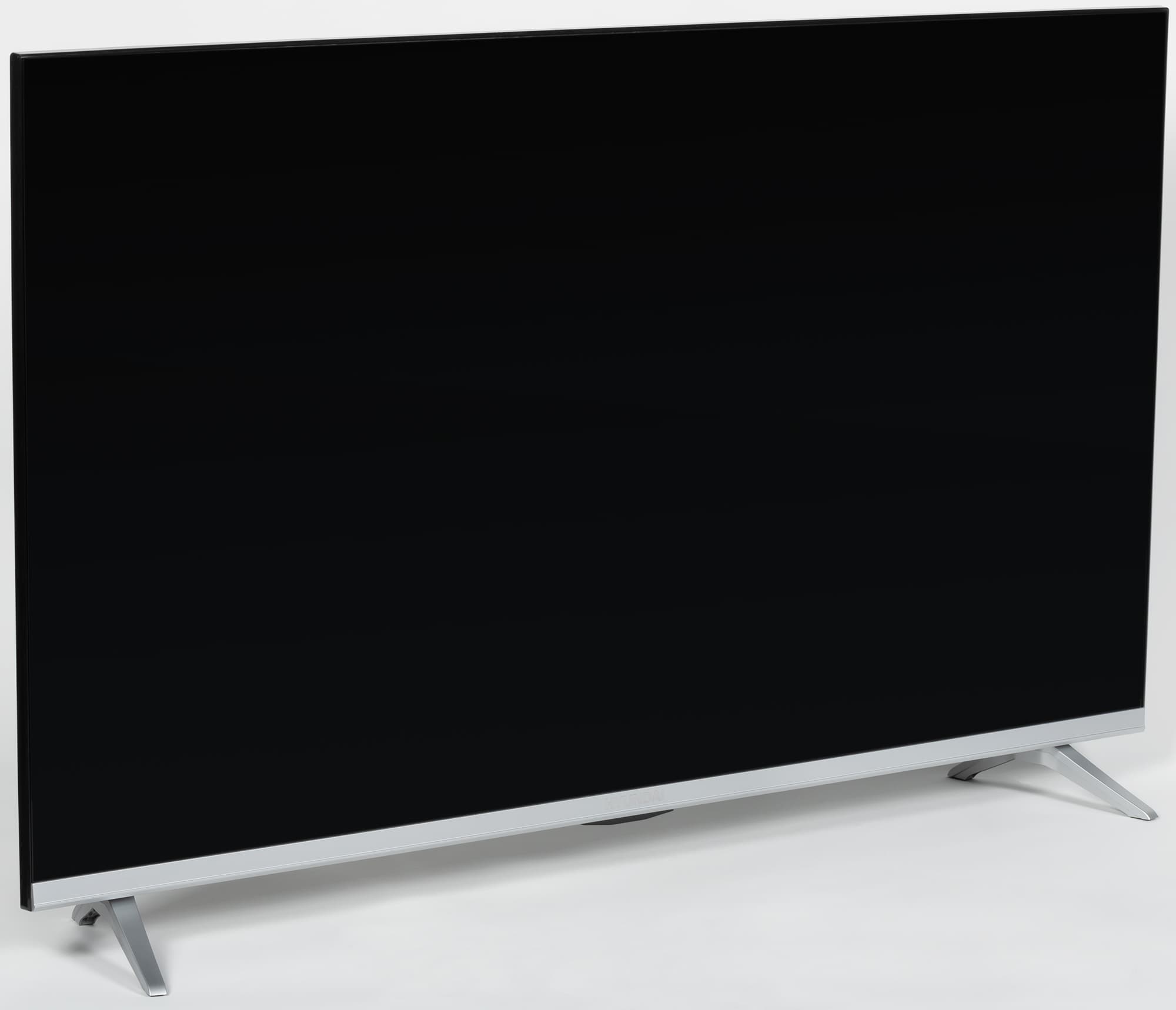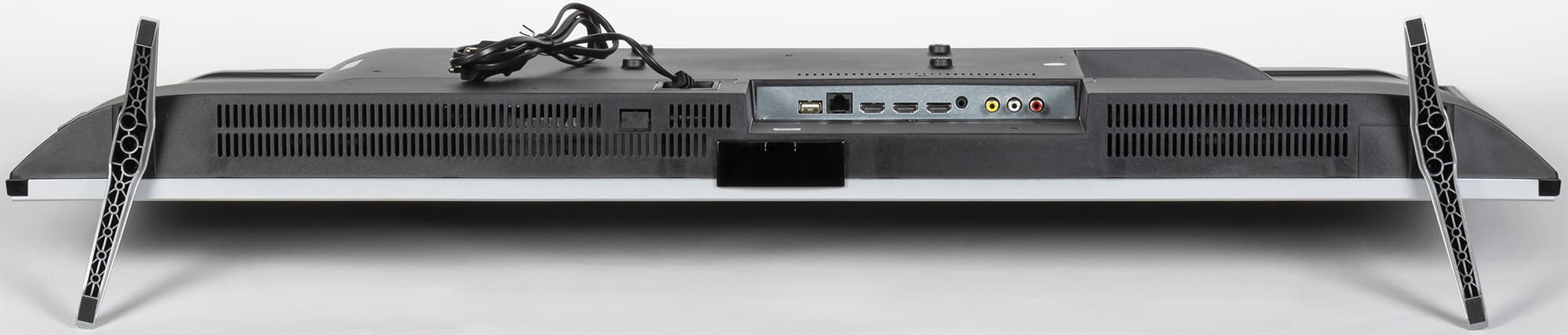 Штатная подставка состоит из двух пластиковых ножек галочкой, которые винтами прикрепляются к нижнему торцу. Опираются ножки на противоскользящие накладки из упругого пластика. Жесткость конструкции соответствует весу телевизора. Телевизор стоит устойчиво, без видимого наклона. Расстояние между крайними точками ножек 863 мм.