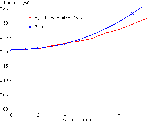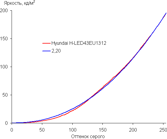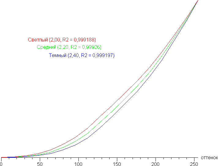 Аппроксимация полученной гамма-кривой дала показатель 2,20, что в точности равно стандартному значению 2,2. Однако при этом реальная гамма-кривая заметно отклоняется от аппроксимирующей степенной функции: