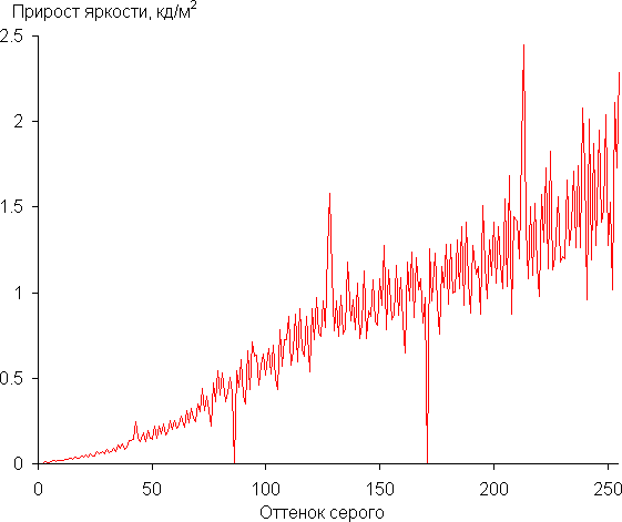 Реальная гамма-кривая ближе к стандартной в случае варианта Средний, поэтому далее мы измерили яркость 256 оттенков серого (от 0, 0, 0 до 255, 255, 255) при этом значении (снизив значение настройки Контраст до 49, чтобы в светах не было завала на один оттенок). График ниже показывает прирост (не абсолютное значение!) яркости между соседними полутонами: