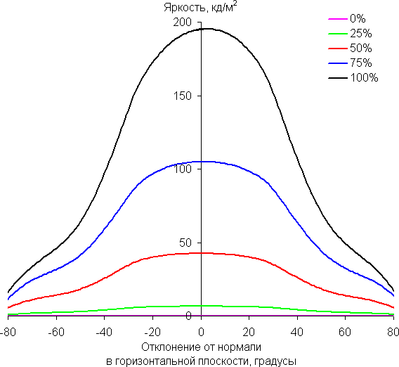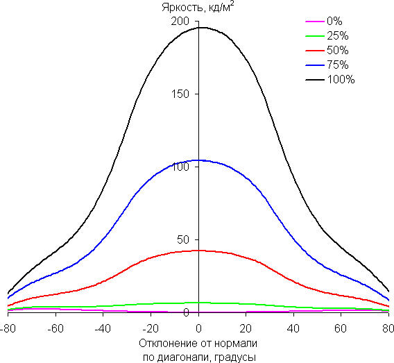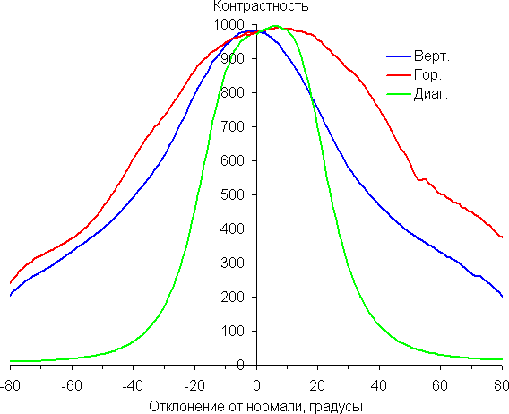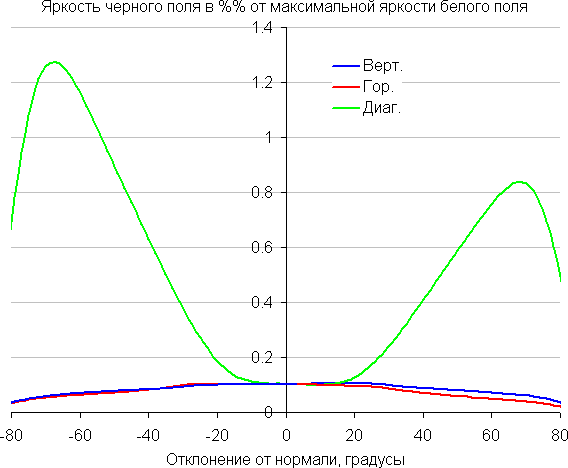 По скорости снижения яркости углы обзора не самые плохие. При отклонении в диагональном направлении яркость черного поля начинает резко возрастать уже при 20°-30° отклонения от перпендикуляра к экрану. Если сидеть не очень далеко от экрана, то черное поле по углам будет заметно светлее, чем в центре, но оставаться условно нейтрально-серым. Контрастность в диапазоне углов ±82° в случае отклонения по диагонали в одном направлении опускается ниже отметки 10:1 при −78°.
