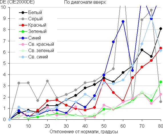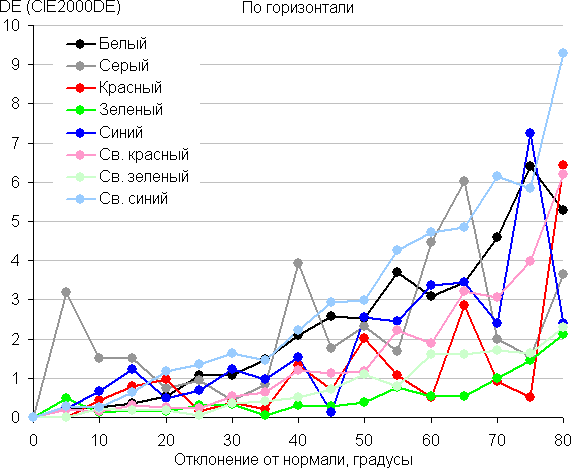 Для количественной характеристики изменения цветопередачи мы провели колориметрические измерения для белого, серого (127, 127, 127), красного, зеленого и синего, а также светло-красного, светло-зеленого и светло-синего полей во весь экран с использованием установки, подобной той, что применялась в предыдущем тесте. Измерения проводились в диапазоне углов от 0° (датчик направлен перпендикулярно к экрану) до 80° с шагом в 5°. Полученные значения интенсивностей были пересчитаны в отклонение ΔE относительно замера каждого поля при перпендикулярном положении датчика относительно экрана. Результаты представлены ниже: