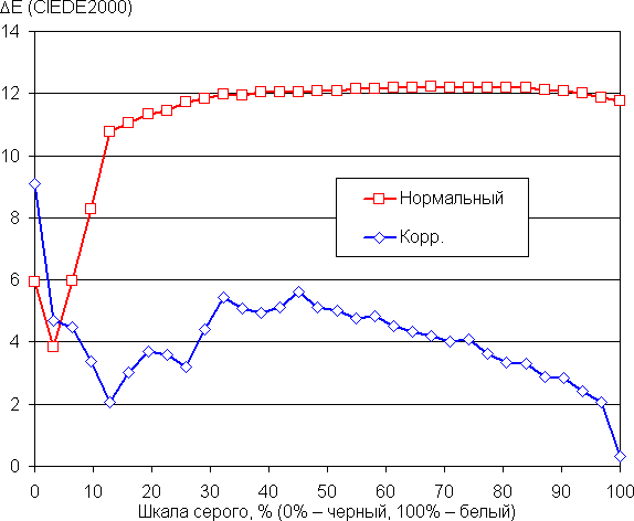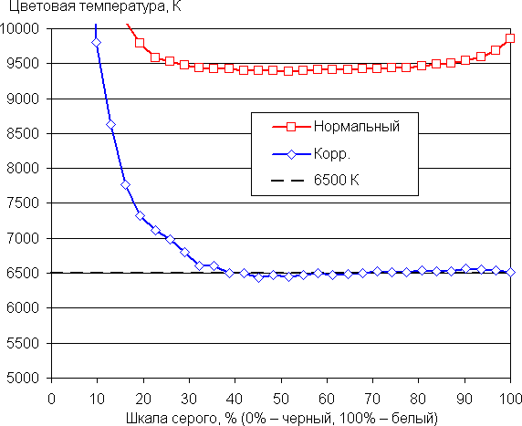 Графики ниже показывают цветовую температуру на различных участках шкалы серого и отклонение от спектра абсолютно черного тела (параметр ΔE) при выборе варианта Нормальный (самый яркий режим) для настройки Цветовая температура и после коррекции цветового баланса настройками усиления трех основных цветов (значения 0, −47 и −51 для усиления красного, зеленого и синего цветов):