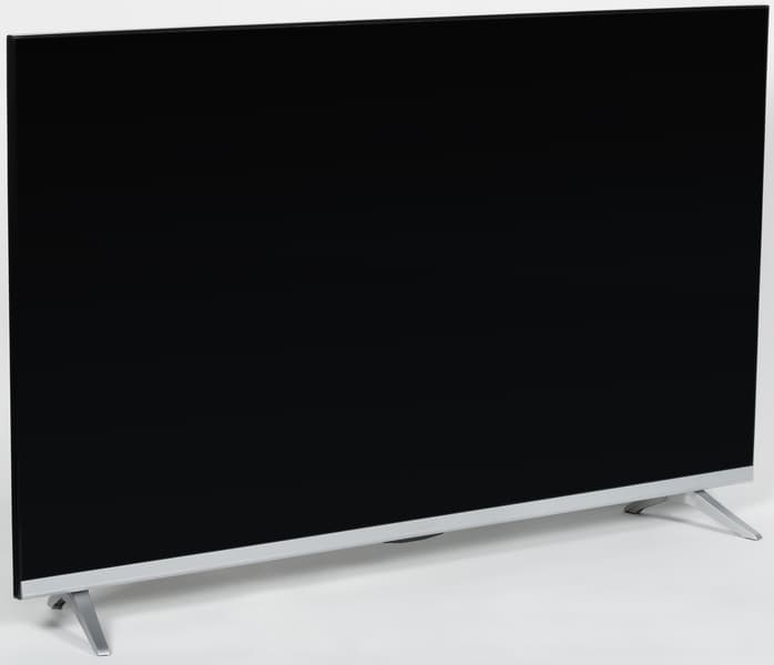 Экран визуально безрамочный, он выглядит как монолитная поверхность, ограниченная снизу узкой планкой, а сверху и с боков — узкой окантовкой. Окантовка изготовлена из пластика с черной глянцевой поверхностью. Планка также пластиковая, но уже с серебристым покрытием. Ножки — аналогично пластиковые с серебристым покрытием. Поверхности планки и ножек могут отсвечивать, что будет слегка мешать просмотру ТВ. Выведя изображение на экран, можно увидеть, что на самом деле между внешними границами экрана и собственно областью отображения есть неширокие поля (от области отображения до внешних границ экрана сверху и с боков по 10 мм, а снизу — 20 мм). По центру фронтальной планки располагается логотип из наклеенных пластиковых букв с металлизированной зеркально-гладкой поверхностью