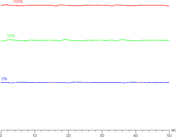 На любом уровне яркости значимая модуляция подсветки отсутствует, поэтому нет и никакого мерцания экрана. В доказательство приведем графики зависимости яркости (вертикальная ось) от времени (горизонтальная ось) при различных значениях настройки Подсветка: