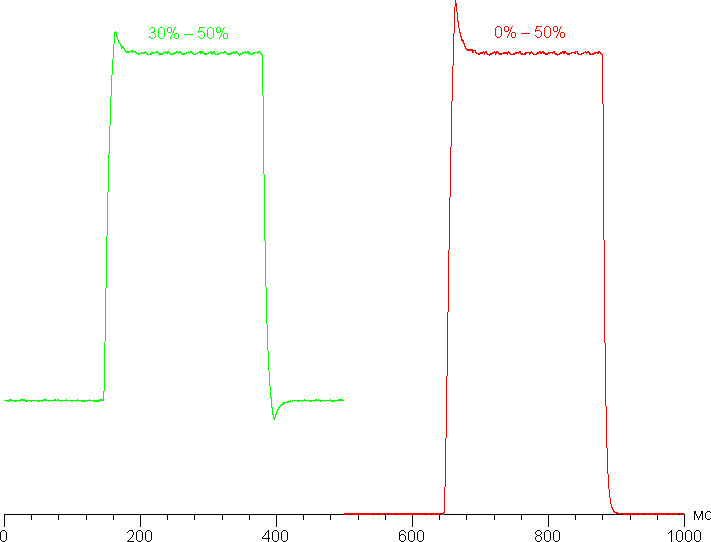 Время отклика при переходе черный-белый-черный равно 17 мс (9 мс вкл. + 8 мс выкл.). Переходы между полутонами происходят в среднем за 18 мс в сумме. Есть очень слабый «разгон» матрицы, не приводящий к видимым артефактам, — на фронтах включения и выключения в случае некоторых переходов есть едва обнаруживаемые выбросы.