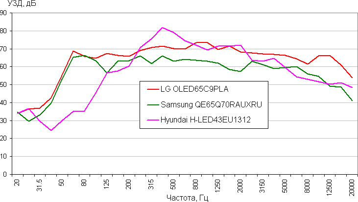 Громкость встроенной акустической системы для жилой комнаты, соответствующей по размерам данной диагонали экрана, достаточная. Стереофонический эффект с трудом, но распознать можно. Присутствуют высокие и средние частоты, низких — практически нет. Явно есть паразитные резонансы корпуса. В целом даже для класса встроенной в телевизор акустики ее качество среднее. Сравним АЧХ этого ТВ с АЧХ двух телевизоров высшего класса (получена с помощью шумомера при воспроизведении звукового файла с розовым шумом, интервал УЗД в 1/3 октавах):