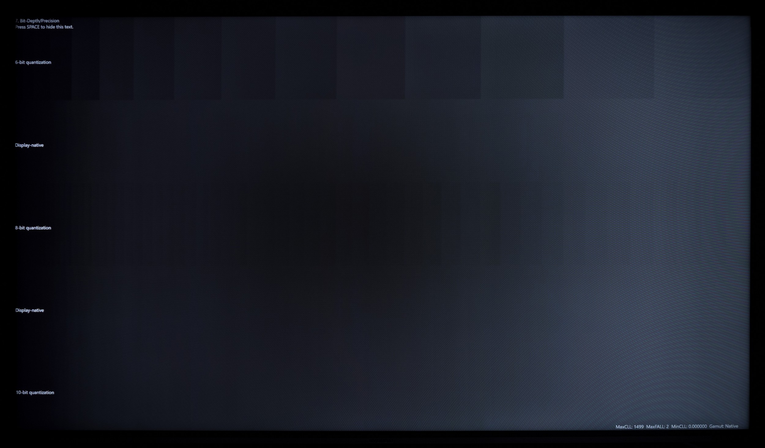 В соответствии с этим и использованием в телевизоре VA-подобной матрицы, в тесте на воспроизведения сложных темных переходов (бандинг-тест) телевизор показал себя типично плохо с хорошей различимостью паразитных оттенков и грубых концентрических переходов.