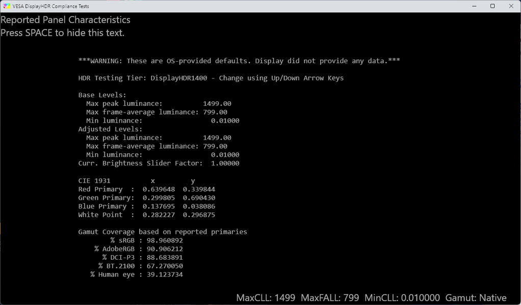 К тому же, исходя из данных, отмеченных в разделе «Сведения о дисплее», а также специальной отметки в информационном блоке утилиты VESA DisplayHDR Test, телевизор не передает полноценно всю необходимую информацию о своих возможностях по работе с HDR-контентом. Но такое случается даже в случае с решениями за ощутимо большие деньги. Простительно.