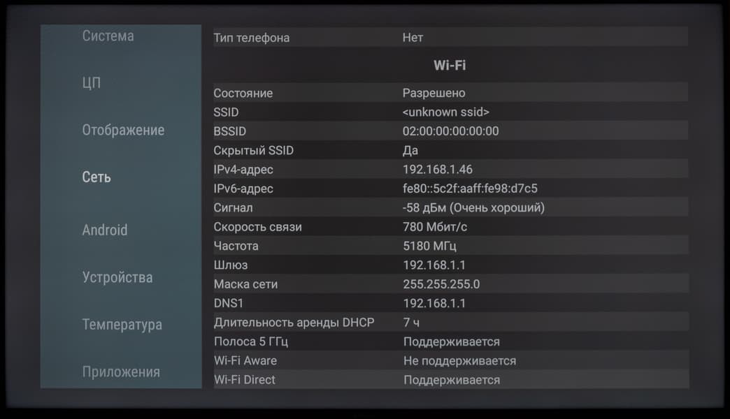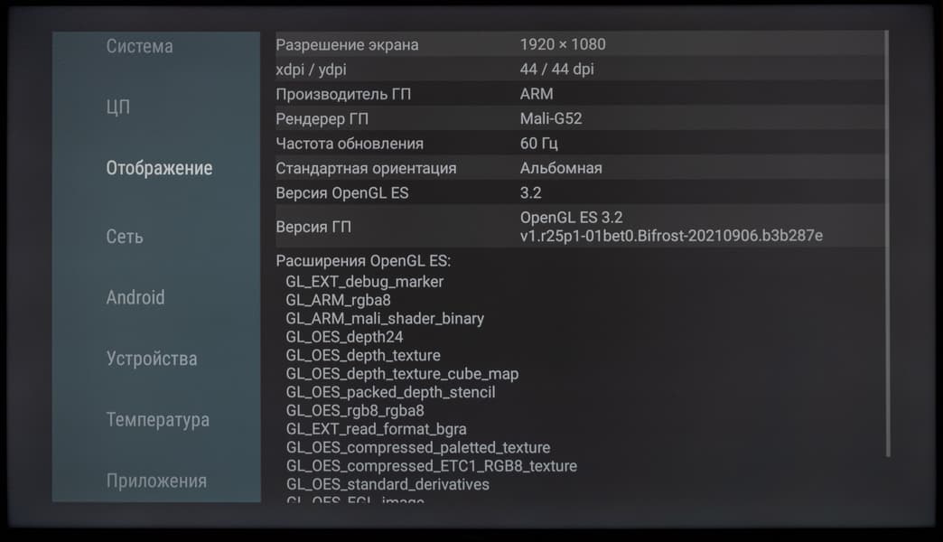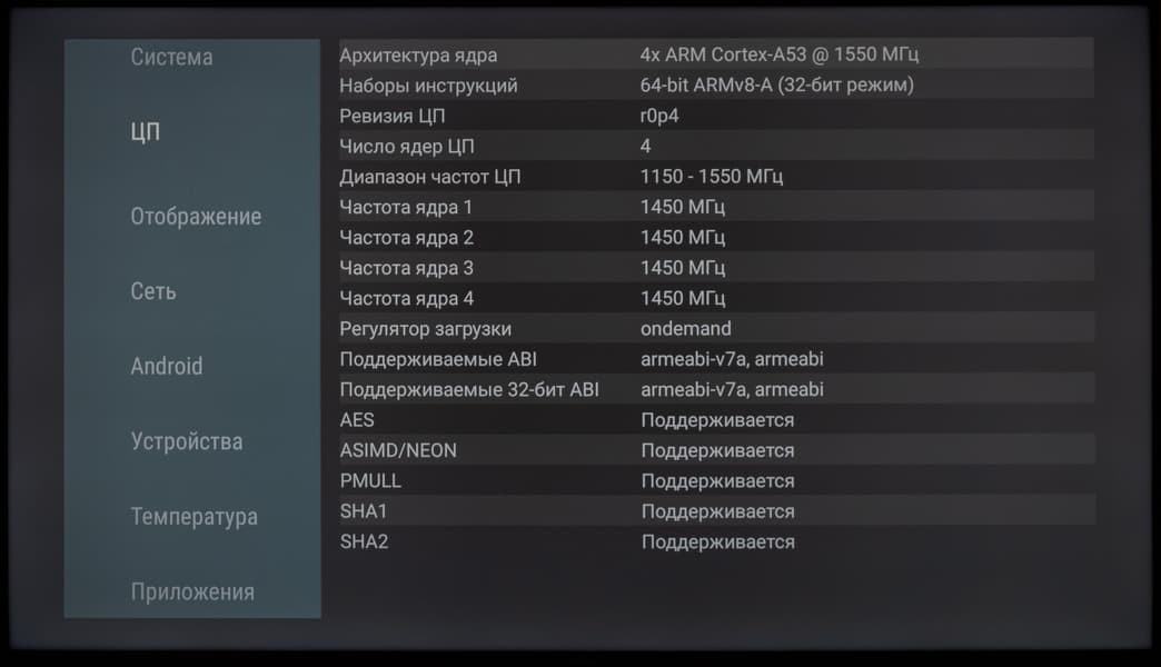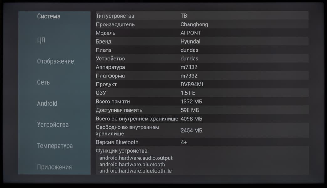 После установки информационного приложения AIDA64 через скачанный APK-файл мы получили доступ к информации по конфигурации аппаратной части рассматриваемого телевизора: