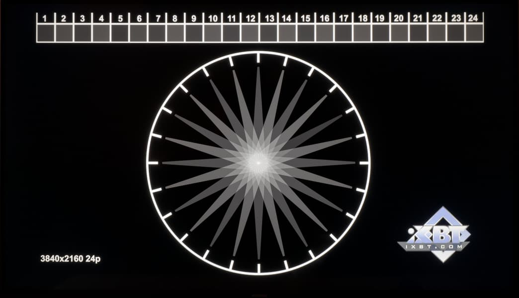 Если посмотреть на неравномерность при переходе к более темным серым оттенкам с их выводом на всю площадь экрана ТВ, то вдобавок можно заметить слабо выраженные вертикальные полосы (с легким паразитным оттенком), свидетельствующие о расположении лент светодиодной подсветки, ведь у героя обзора она — прямая (Direct-LED), а поэтому подобная особенность — в порядке нормы.