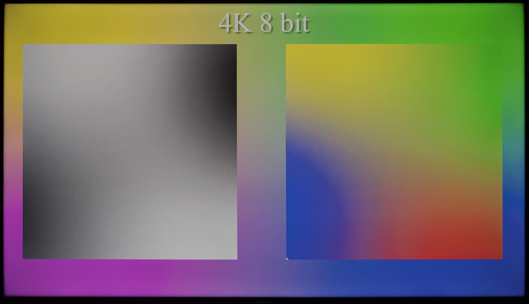 Наглядно видно, что телевизор способен выводить градиенты в 10-битном режиме более качественно, чем в стандартном 8-битном. Но в большей степени это будет актуально при выводе HDR-контента с соответствующими требованиями к ТВ. Использование же программной эмуляции до 12 бит через драйвер видеокарты не приносит видимых преимуществ над 10-битным выводом сигнала.