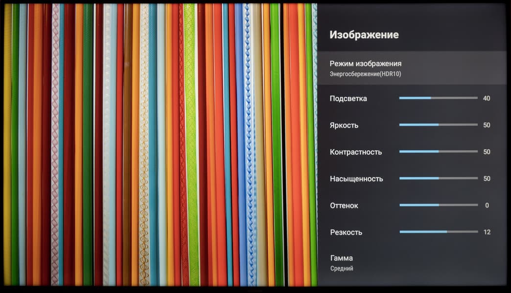 Среди доступных режимов гаммы по умолчанию выбран «Средний». На фоне двух других именно он выглядит оптимальным для постоянно использования и дальнейшей настройки. Если же есть желание несколько снизить или увеличить визуальную контрастность картинки на экране телевизора, то можете воспользоваться режимами «Светлая» (гамма 1,93) и «Темная» (гамма 2,31).