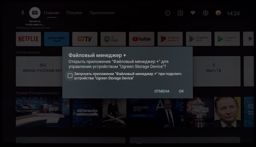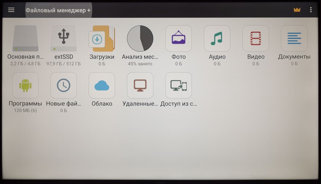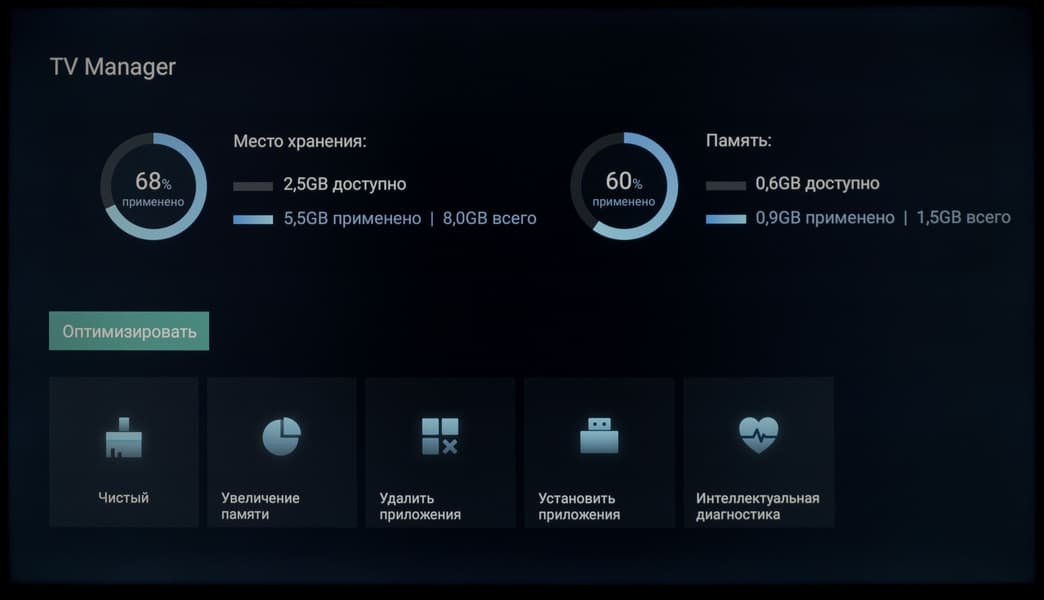 Уже знакомый встроенный в телевизор TV Manager обеспечивает быстрый доступ к различным очисткам системы, ее диагностики, установке и удалению приложений. При подключении внешнего накопителя система уведомляет о его обнаружении и при наличии нескольких вариантов «Проводников» предлагает установить необходимый по умолчанию.