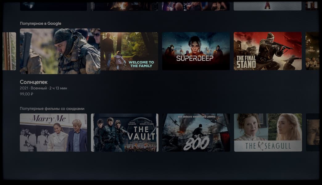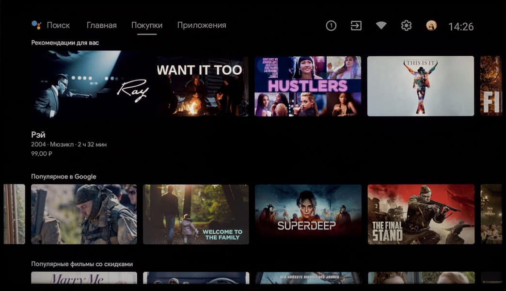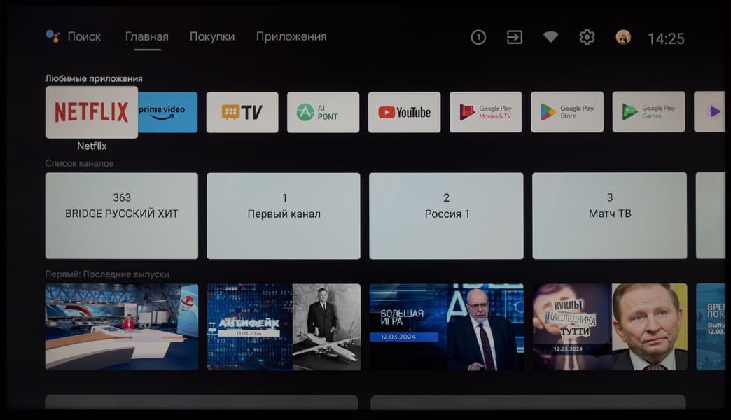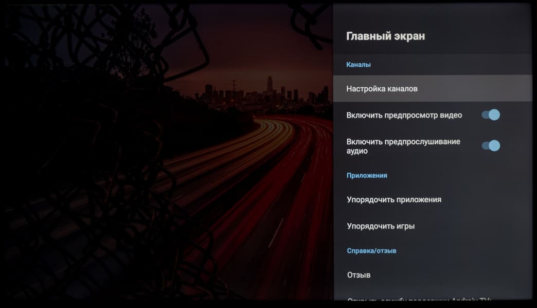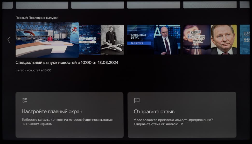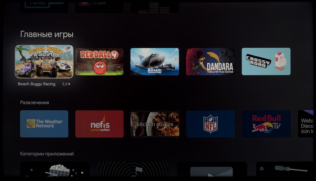 Главный экран в Android TV многим хорошо знаком и представляет собой несколько горизонтальных лент с плитками избранных установленных приложений, избранного контента и рекомендуемого контента, предоставляемого различными программами, в том числе с разбивкой на каналы. Надписи слева над лентами поясняют, к чему относится содержимое лент.