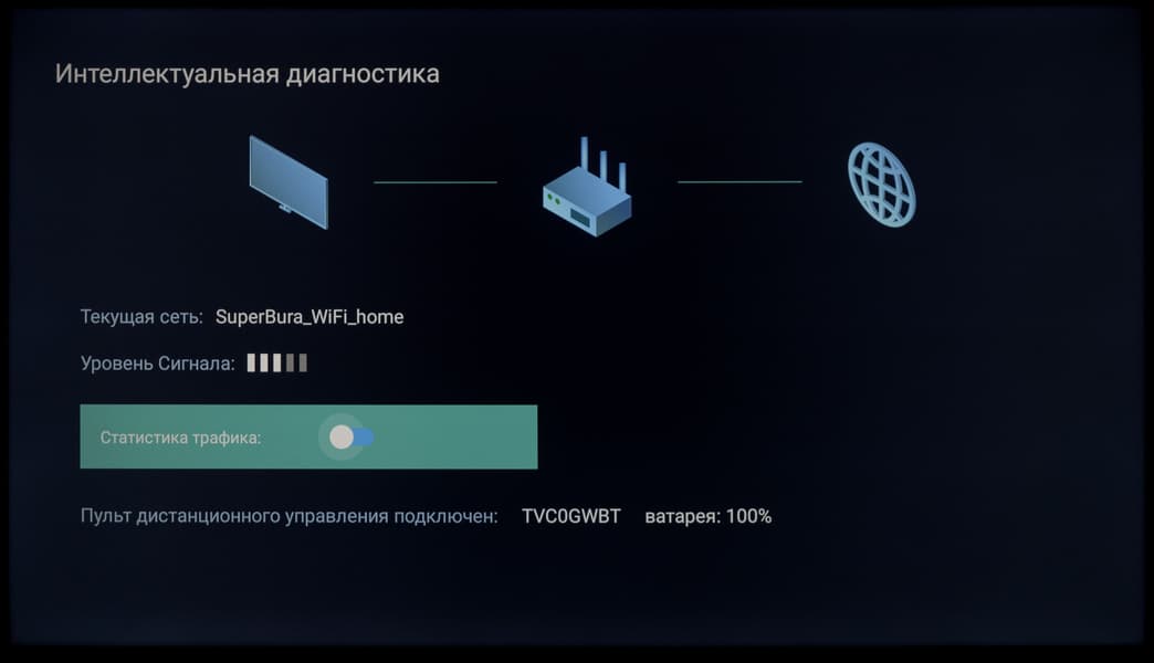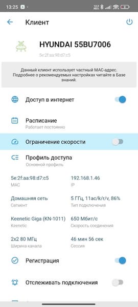 В развернутой сети 5 ГГц на базе роутера Keenetic Giga, при нахождении телевизора в 5 метрах по прямой от него с преградой в виде монолитной стены, телевизор Hyundai продемонстрировал стабильную скорость подключения в 650 Мбит/c (тип подключения — 11ac/k/r/v, 2×2 80 МГц), которая иногда становилась выше. Это очень достойный результат.