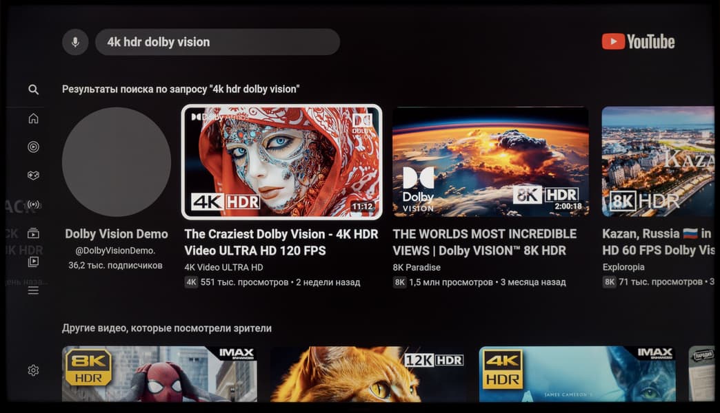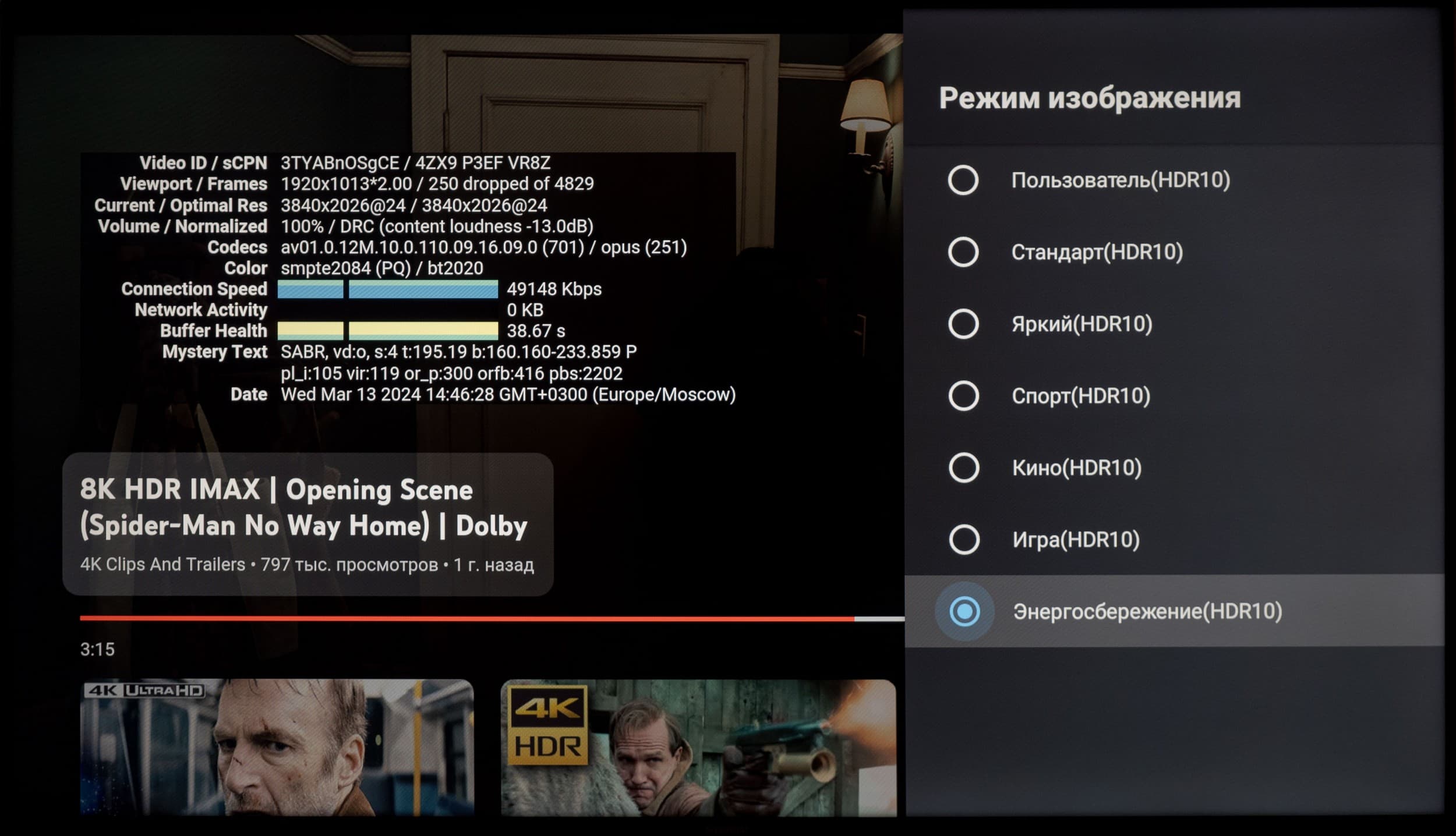 Между тем, телевизором поддерживается воспроизведение видеофайлов HDR (HDR10, Dolby Vision и HLG, которые телевизор выводит как HDR10-совместимые), контейнеры MP4, TS, WebM и MKV, кодеки AV1, VP9 и H.265, а в случае файлов с 10 бит на цвет, согласно визуальной оценке, градаций оттенков ощутимо больше, чем у 8-битных файлов, но их визуальное качество не сильно удивляет.