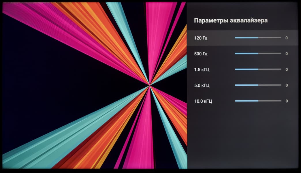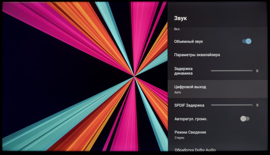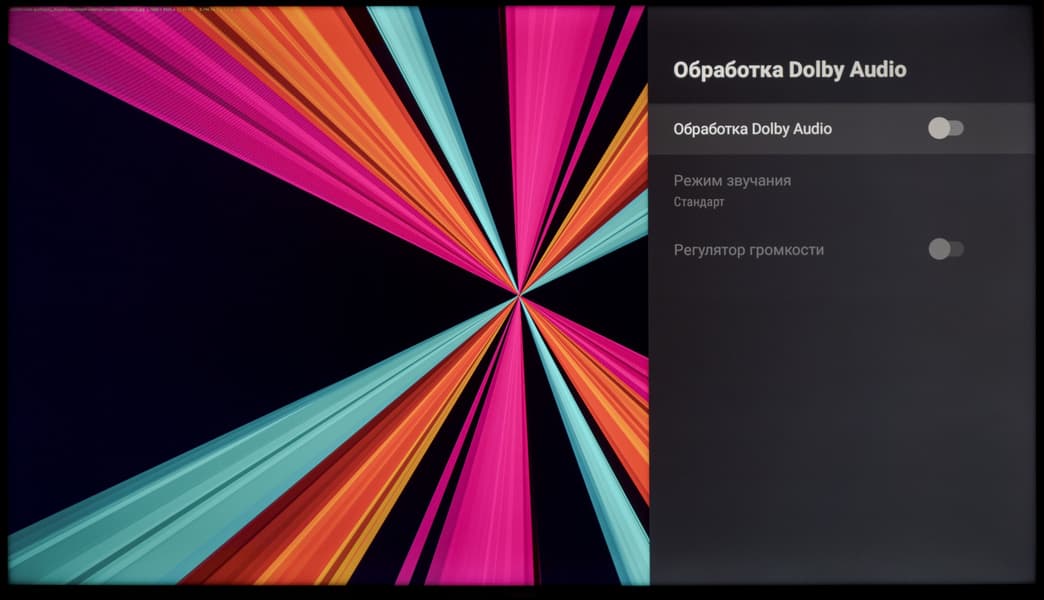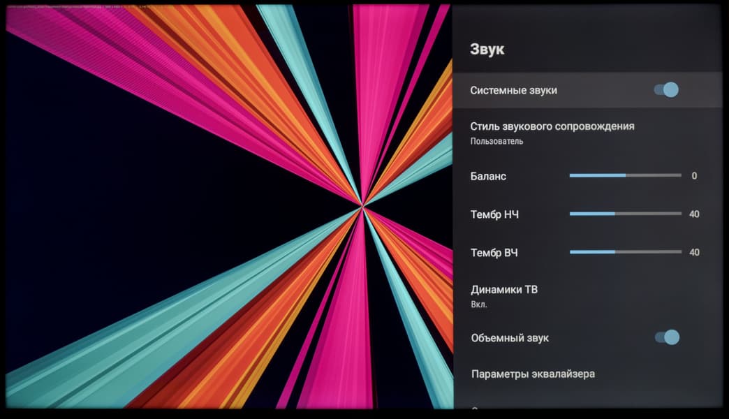 В разделе «Звук» операционной системы есть предустановленные режимы эквалайзера, а также доступна ручная регулировка баланса, корректировка низких и высоких частот, активация функций «Объемный звук» (никаких значимых изменений звука не происходит) и автоматического управления громкостью (актуально для источников с сильно отличающимся уровнем аудиосигнала), выбор цифрового выхода, включение обработки Dolby Audio.