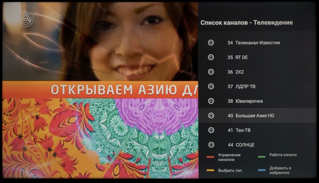 Быстрый переход к просмотру ТВ-программ можно осуществить с помощью соответствующей — выделенной кнопки на пульте ДУ либо перейдя в специальный раздел в самой оболочке ОС. Все найденные кабельные каналы (как аналоговые, так и цифровые) отображаются в отдельном списке и представлены без цветных иконок/пиктограмм. Можно произвести фильтрацию по типу каналов и их доступности.
