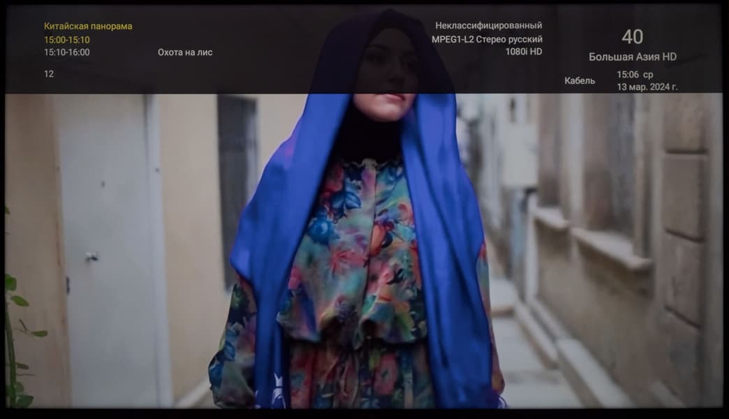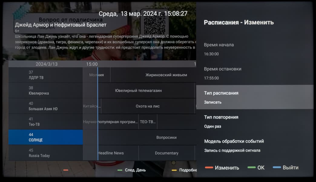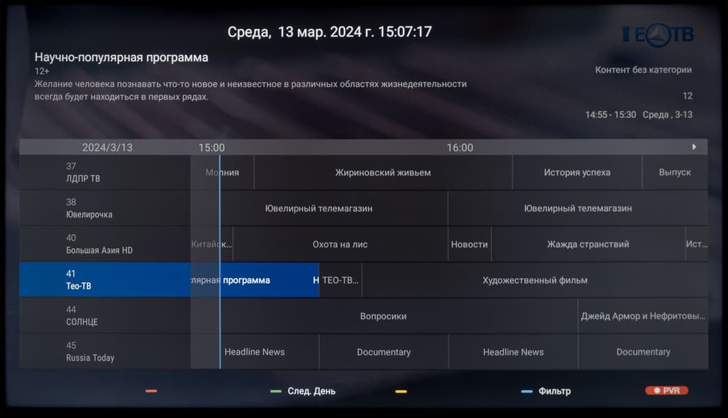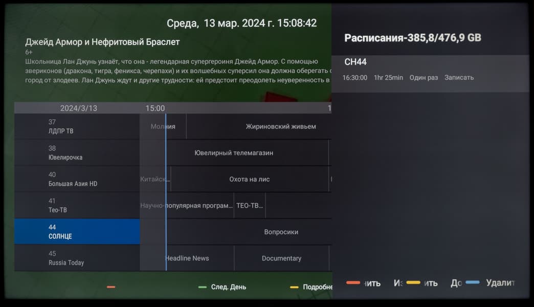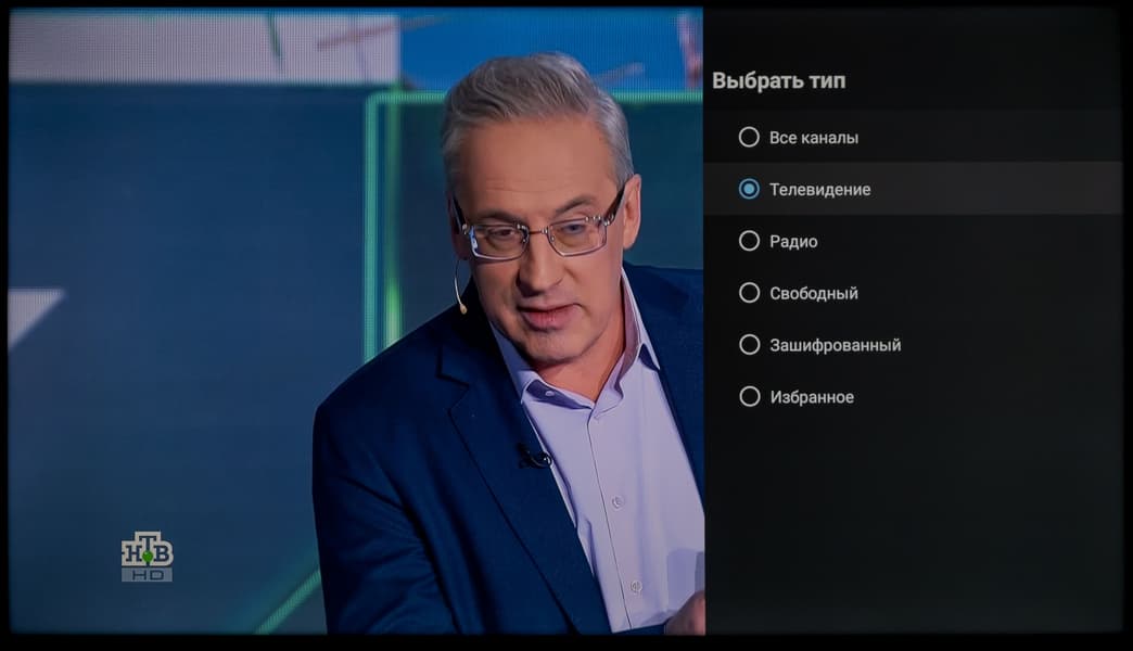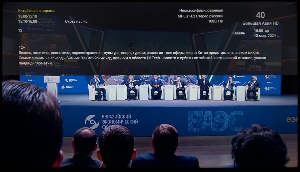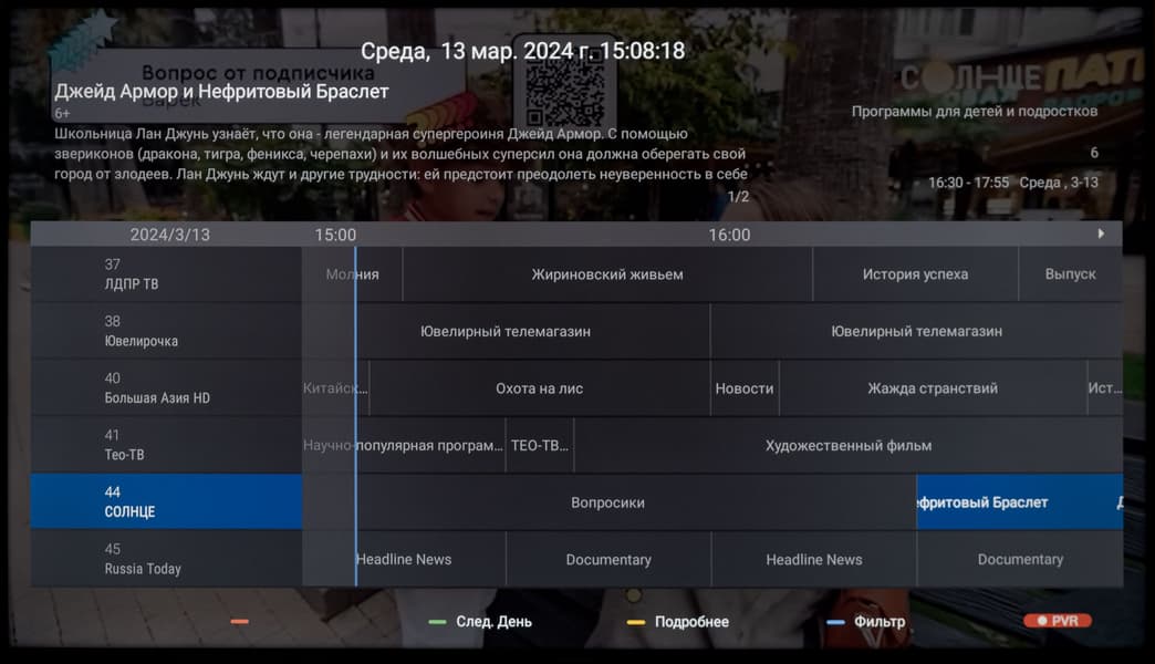 У телевизора есть базовая поддержка электронной программы передач — можно посмотреть, что именно идет или будет идти на текущем и других каналах и прочитать краткое описание, в том числе вывести его на треть площади экрана.