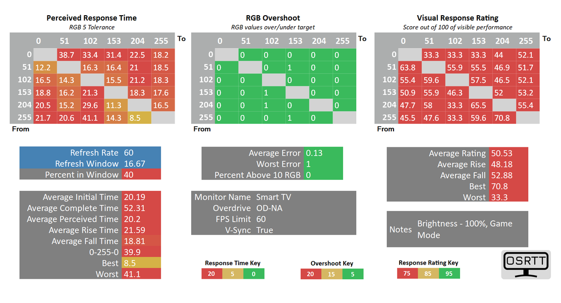 Выше приведены результаты измерения программно-аппаратным комплексом OSRTT, для которого в качестве референсного метода оценки скорости отклика выбран строгий допуск RGB 5 после нормализации значения гаммы в ходе автоматической оценки заводского значения. Данный вариант оценки скорости задает более «жесткие стандарты», чем свойственны для методики измерений со стороны производителей (10%—90% времени перехода по уровню яркости, без учета различий гаммы и артефактов).