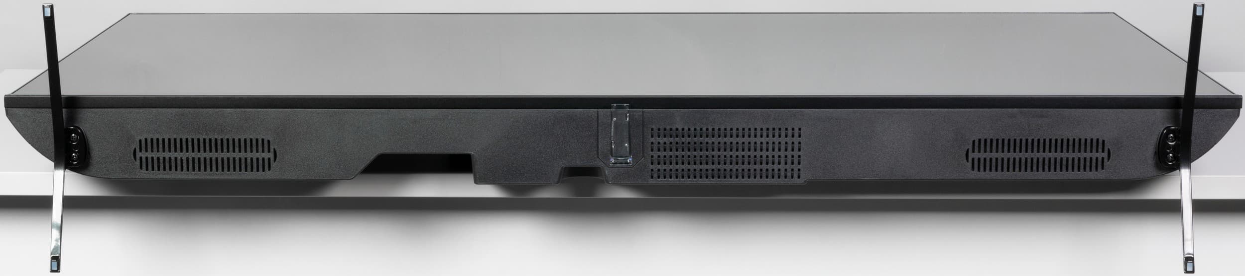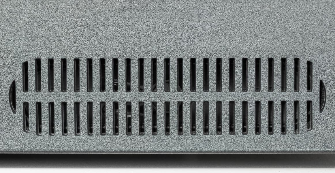 На пластиковом кожухе сверху, сзади и снизу есть вентиляционные решетки. За двумя решетками на нижнем торце можно разглядеть громкоговорители с слегка вытянутыми диффузорами.