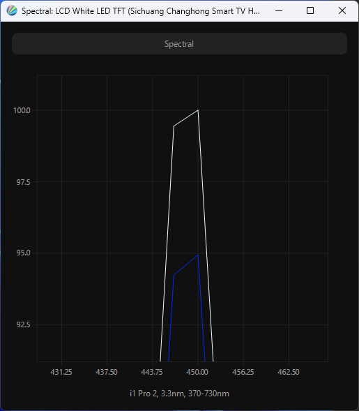 Виден классический пик синего, приходящийся на 448-450 нм, что неспособно обеспечить экран различными современными сертификатами безопасности. Перекрестное подмешивание компонент незначительное. Используется самая стандартная/классическая подсветка W-LED, способная продемонстрировать цветовой охват на уровне sRGB. Собственно так в случае с рассматриваемым ТВ Hyundai и вышло: