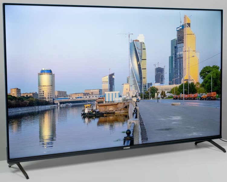 Телевизор Hyundai оснащен VA-матрицей, что снижает его стабильность изображения по площади матрицы и ухудшает углы обзора на фоне некоторых аналогов с IPS. Впрочем, разница может быть не такой уж и большой, а в условиях просмотра парой человек примерно с одной точки проблем возникнуть не должно вовсе.
