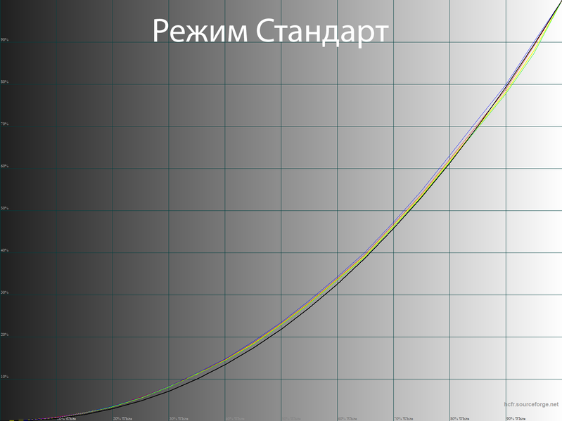 Ниже приведен спектр для белого поля (белая линия), наложенный на спектры красного, зеленого и синего полей (линии соответствующих цветов) для режима экрана «Стандарт» с полной цветовой гаммой: