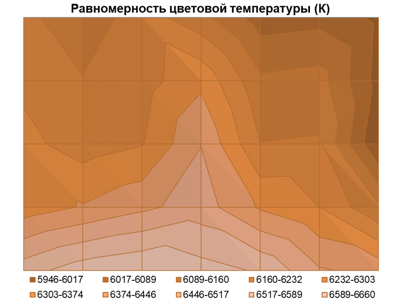 Чуть больше вопросов у нас к равномерности цветовой температуры: среднее отклонение от центральной точки составило 2,9%, максимальное — 7,7%, а вариация значений по полю экрана превысила 700 К, что может быть заметно и без использования измерительного оборудования.
