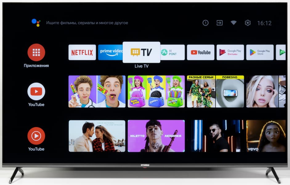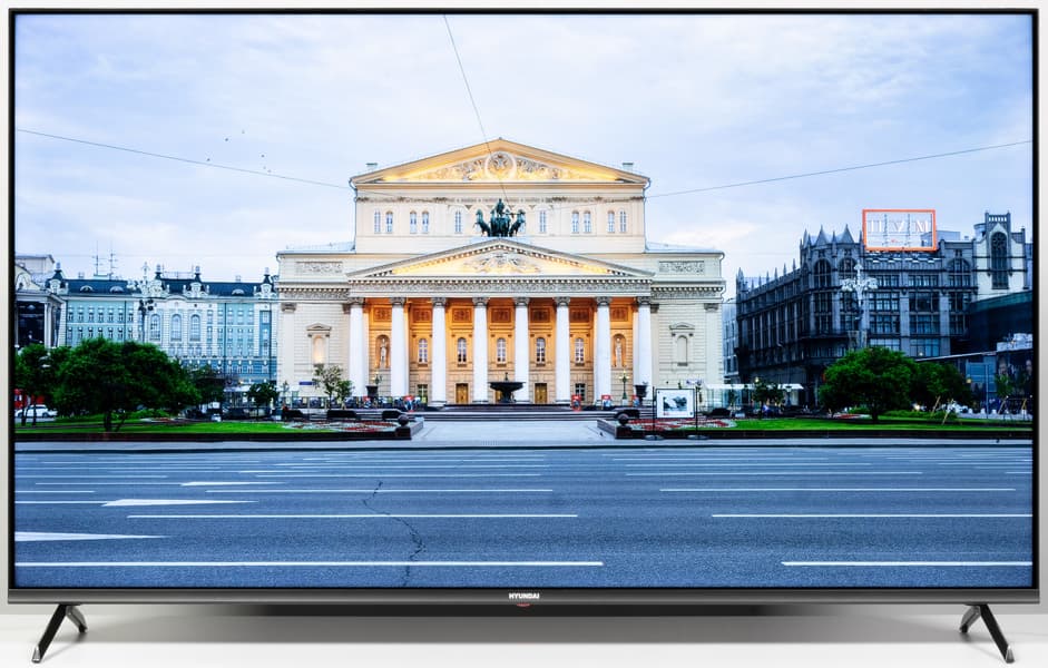 Основные запросы указаны. А что с финансовой стороной вопроса? Как правило, потребитель не хочет переплачивать, но и брать «кота в мешке» тоже нет никакого желания. Тут сразу появляются знакомые бренды с ценником чуть выше, но официальной гарантией и возможностью без проблем купить в одной из крупных торговых сетей. Одна из подходящих моделей есть и у компании Hyundai — с 55-дюймовой 4K VA-матрицей с классической подсветкой Direct W-LED и с Android TV на борту: Hyundai H-LED55BU7006. Стоимость тоже приятная: телевизор можно приобрести примерно за 35-40 тысяч рублей, а с различными бонусными программами и кэшбеком может выйти еще дешевле. Интересное предложение. Давайте познакомимся с ним поближе.