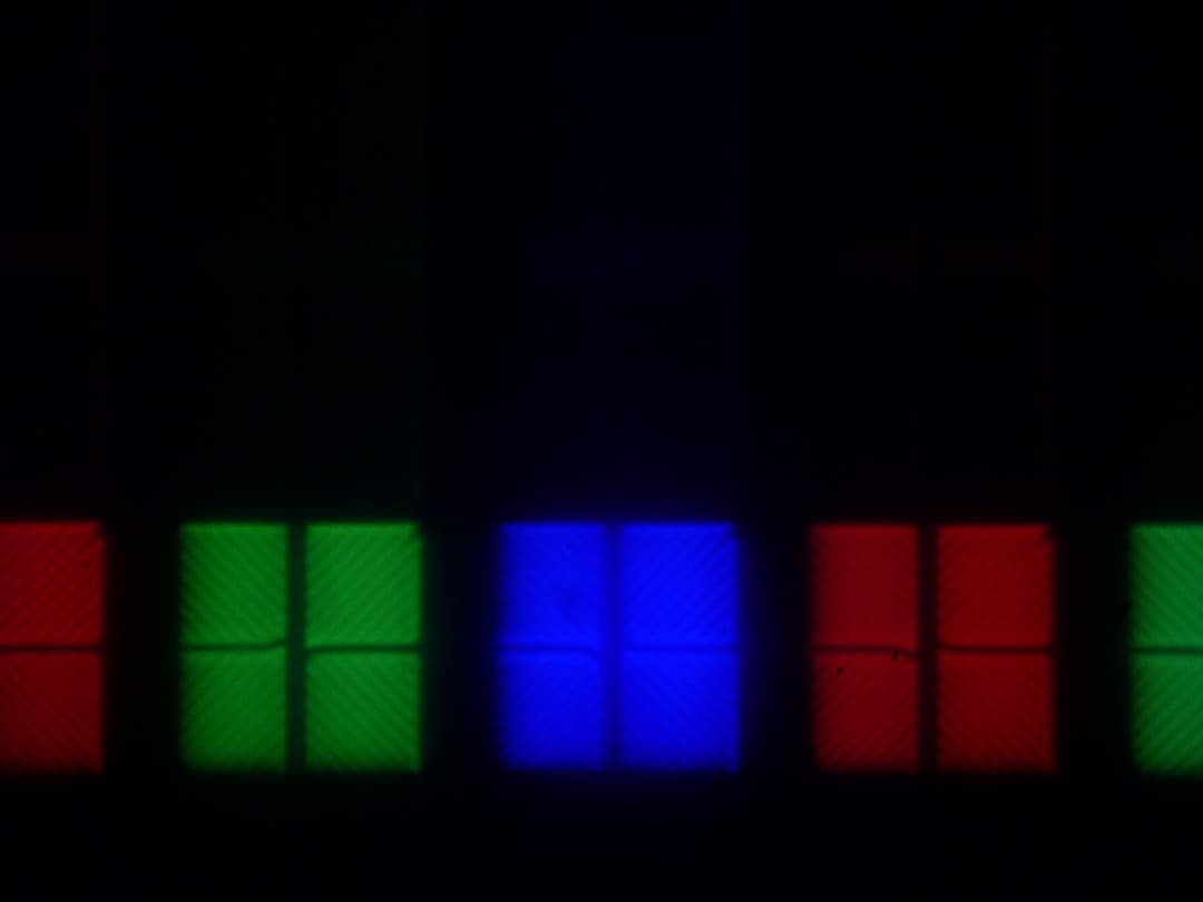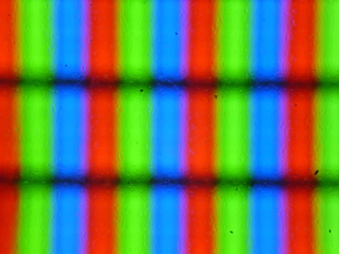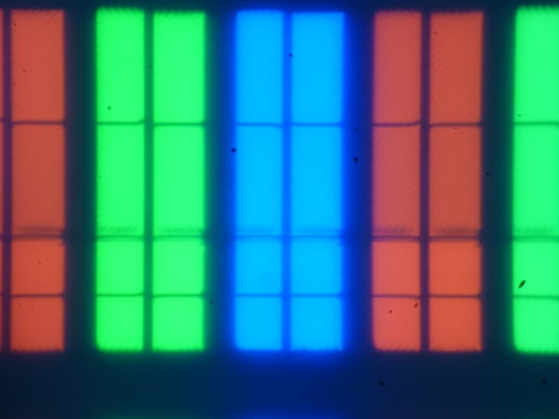 Выявленные характеристики экрана позволяют предположить, что в данном телевизоре установлена матрица типа *VA. Микрофотографии не противоречат этому (черные точки — это пыль на матрице фотоаппарата):