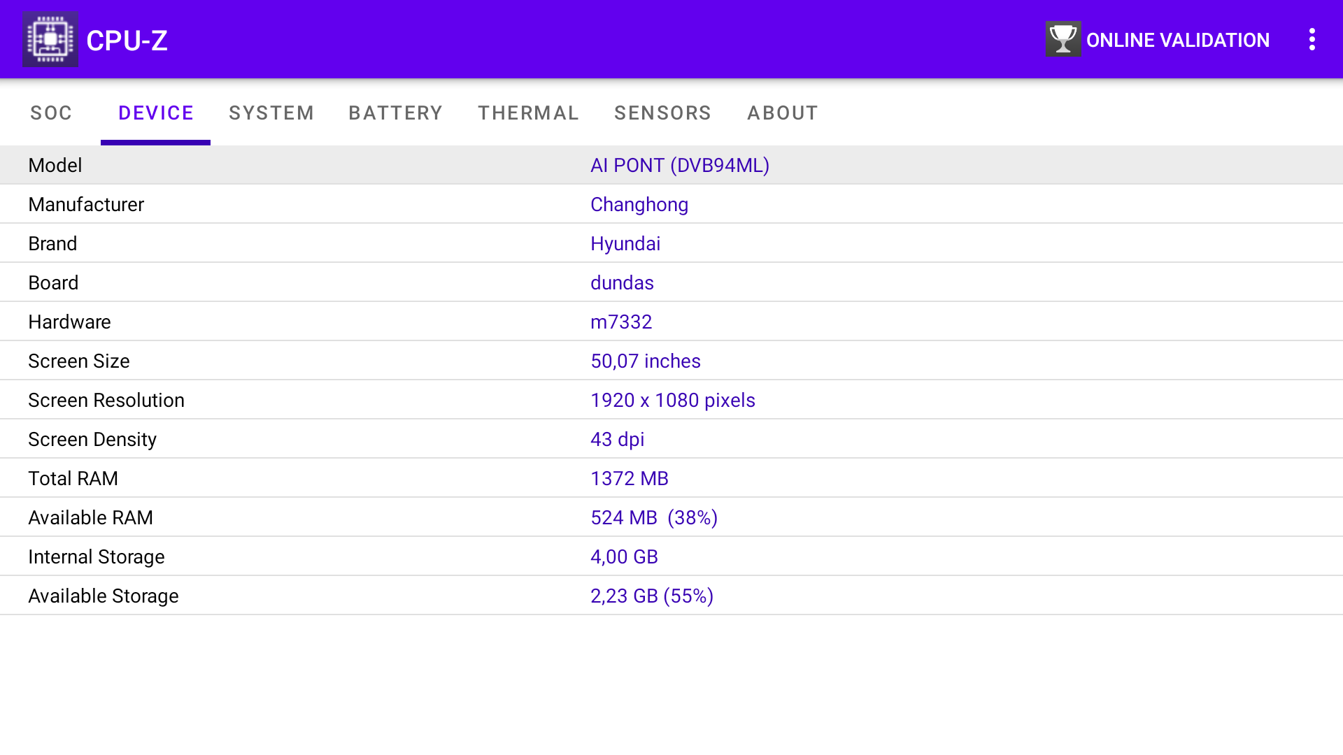 Программной платформой для этого ТВ служит операционная система Android TV, основанная на Android версии 11. Конфигурацию аппаратной части поясняют данные программы CPU-Z: