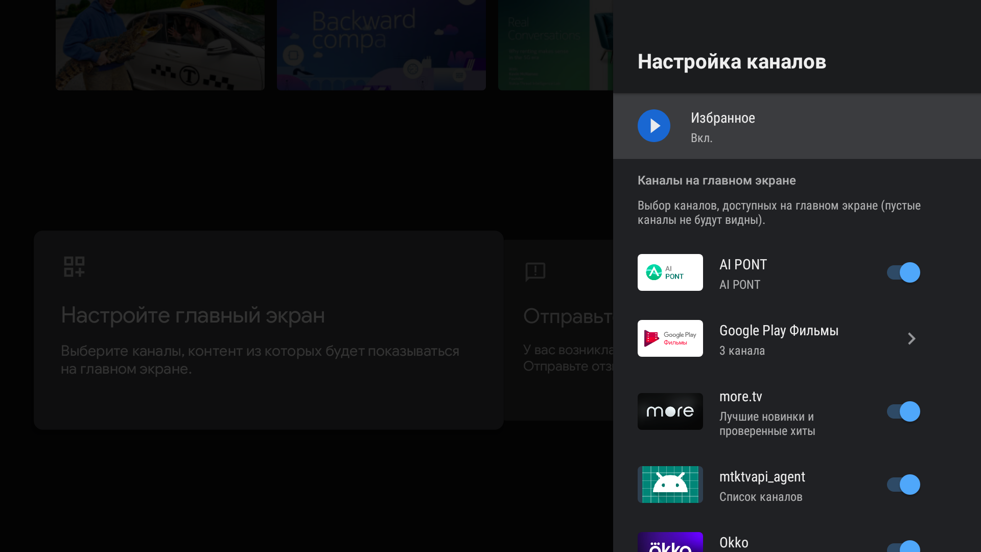 Доступ к настройкам также удобно получить из контекстного меню с плитками, которое можно вывести на экран при просмотре ТВ-каналов или внешних источников видеосигнала.