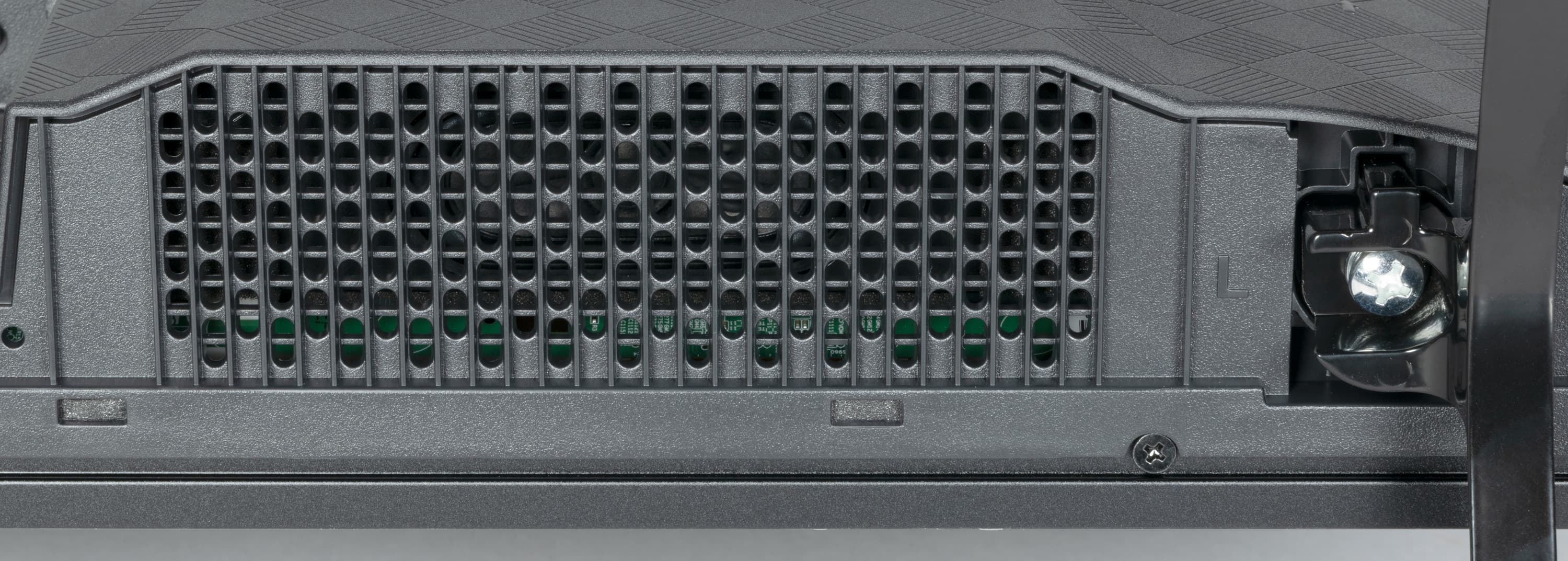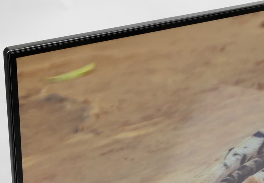 Планка снизу изготовлена из алюминиевого сплава, ее матовая поверхность анодирована и окрашена в черный цвет. На самом деле планка представляет собой уголок, который частично прикрывает нижний торец. Выведя изображение на экран, можно увидеть, что на самом деле между внешними границами экрана и собственно областью отображения есть неширокие поля (от области отображения до внешних границ экрана сверху и с боков по 9 мм, а снизу — 19 мм).