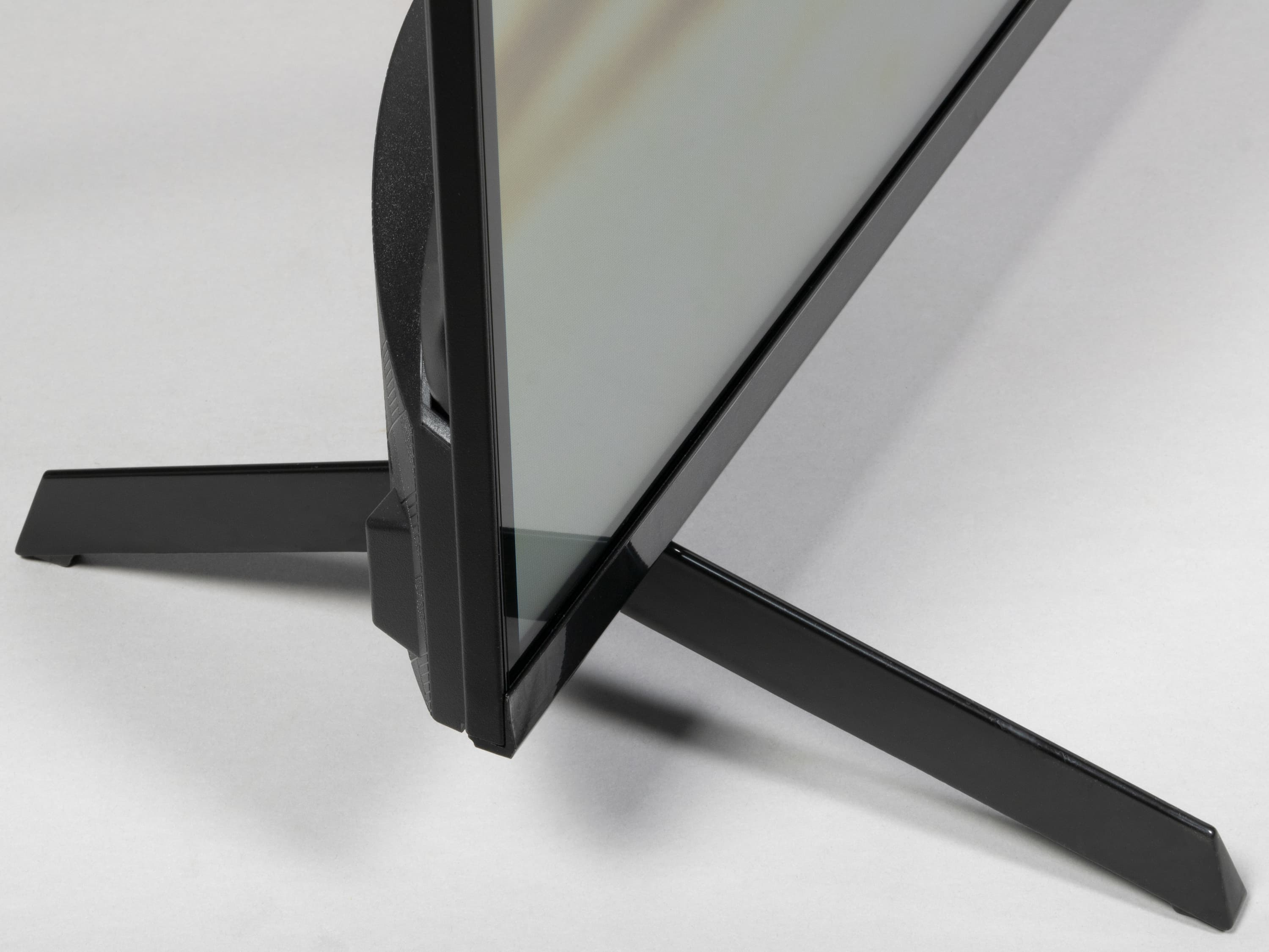 Опираются ножки на противоскользящие накладки из упругого пластика. Расстояние между крайними точками ножек 130,5 см. Жесткость конструкции соответствует весу телевизора. Телевизор стоит устойчиво, без видимого наклона.