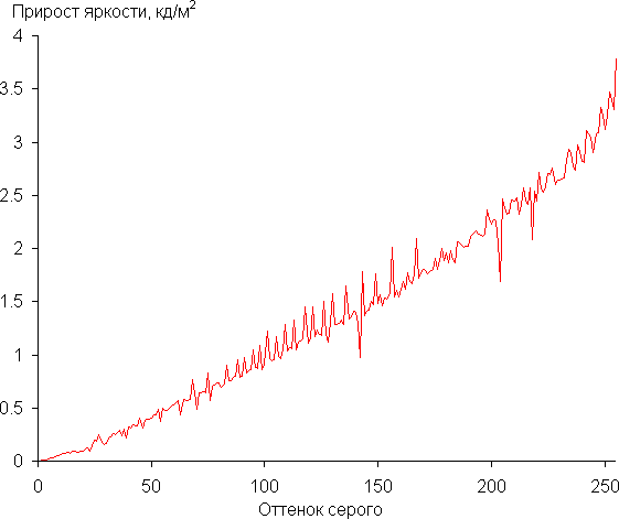 Реальная гамма-кривая ближе к стандартной в случае варианта Средний, поэтому далее мы измерили яркость 256 оттенков серого (от 0, 0, 0 до 255, 255, 255) при этом значении. График ниже показывает прирост (не абсолютное значение!) яркости между соседними полутонами: