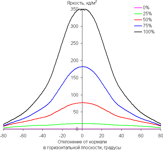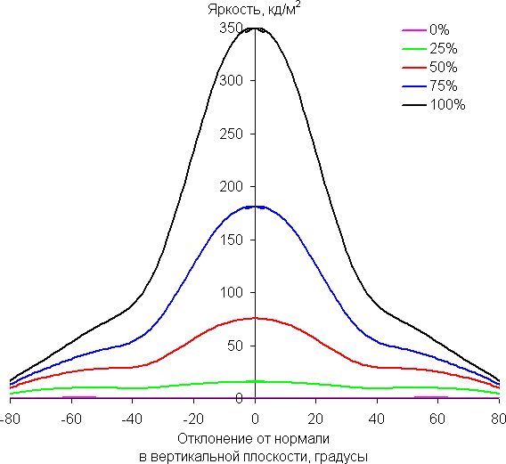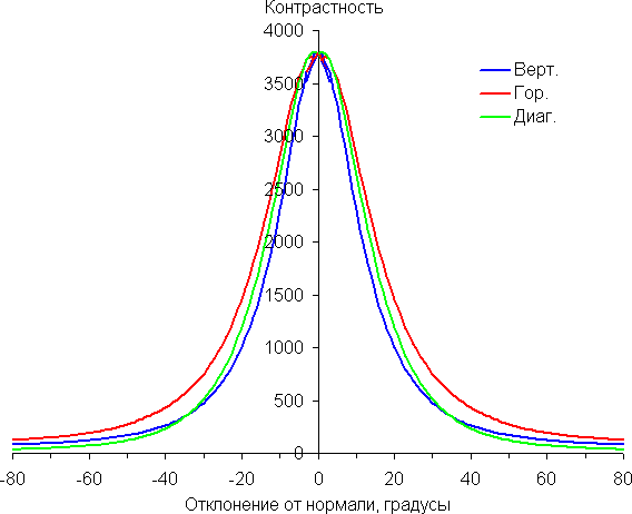 По скорости снижения яркости углы обзора неширокие. При этом в значимом диапазоне измеряемых углов графики яркости полутонов не пересекаются (то есть нет инвертирования яркости оттенков). Яркость черного поля при отклонении от перпендикуляра к экрану возрастает, но всего до примерно 0,13% от максимальной яркости белого поля и только при большом отклонении. Это очень хороший результат. Контрастность в диапазоне углов ±82° для двух направлений значительно превышает 10:1. Для диагонального направления контрастность при отклонении снижается быстрее, но все равно не опускается за эту отметку.