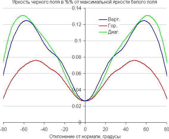 Чтобы выяснить, как меняется яркость экрана при отклонении от перпендикуляра к экрану, мы провели серию измерений яркости черного, белого и оттенков серого в центре экрана в широком диапазоне углов, отклоняя ось датчика в вертикальном, горизонтальном и диагональном направлениях.