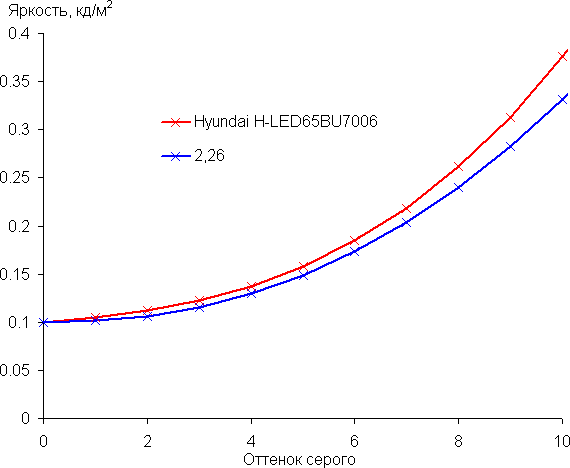 Рост прироста яркости весьма равномерный, и каждый следующий оттенок значимо ярче предыдущего, даже в самой темной области: