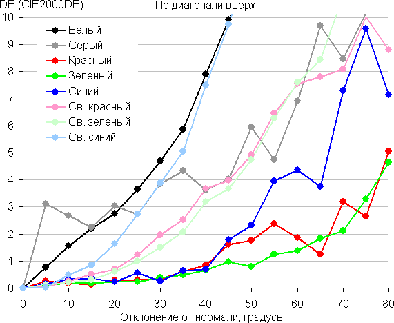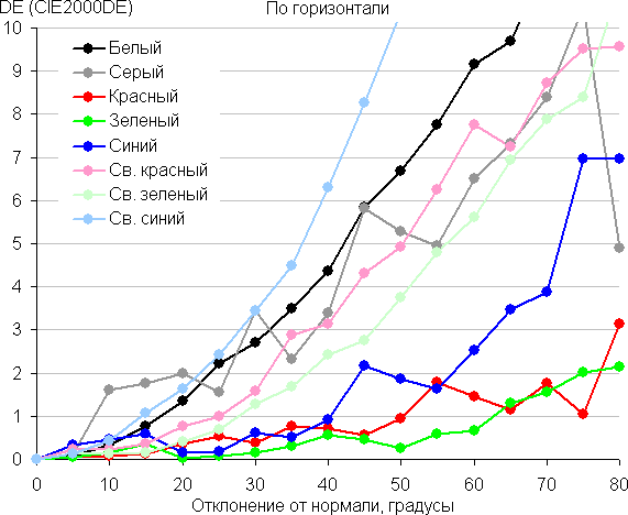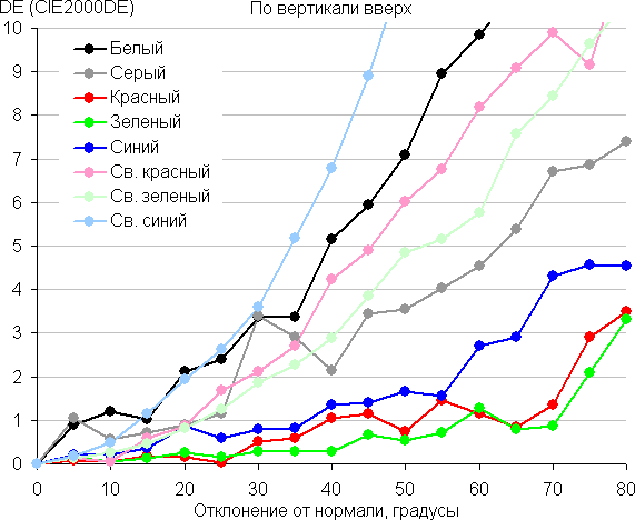 Для количественной характеристики изменения цветопередачи мы провели колориметрические измерения для белого, серого (127, 127, 127), красного, зеленого и синего, а также светло-красного, светло-зеленого и светло-синего полей во весь экран с использованием установки, подобной той, что применялась в предыдущем тесте. Измерения проводились в диапазоне углов от 0° (датчик направлен перпендикулярно к экрану) до 80° с шагом в 5°. Полученные значения интенсивностей были пересчитаны в отклонение ΔE относительно замера каждого поля при перпендикулярном положении датчика относительно экрана. Результаты представлены ниже:
