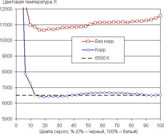 Графики ниже показывают цветовую температуру на различных участках шкалы серого и отклонение от спектра абсолютно черного тела (параметр ΔE) для профиля Пользователь в списке Температура цвета без коррекции и после ручной коррекции (настройки усиления для красного, зеленого и синего цветов — 0/−26/−53):