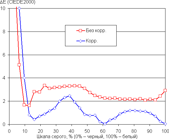 Самый близкий к черному диапазон можно не учитывать, так как в нем цветопередача не так важна, а погрешность измерения цветовых характеристик высокая. После ручной коррекции цветовая температура уже близка к стандартным 6500 К, а ΔE ниже 3 единиц, что даже для профессионального устройства считается хорошим показателем. При этом оба параметра умеренно изменяются от оттенка к оттенку на значимой части шкалы серого, что положительно сказывается на визуальной оценке цветового баланса. Впрочем, с практической точки зрения заниматься коррекцией особого смысла нет, так как максимальная яркость (и, разумеется, контрастность) после коррекции понижается. Вполне можно оставить вариант по умолчанию.