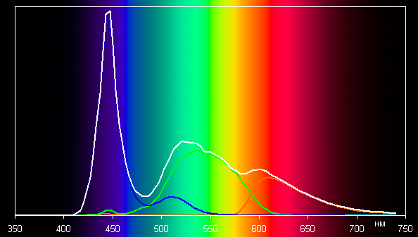 Такой спектр с относительно узким пиком синего и с широкими горбами зеленого и красного цветов характерен для ЖК-матриц, в которых используется белая светодиодная подсветка с синим излучателем и желтым люминофором.